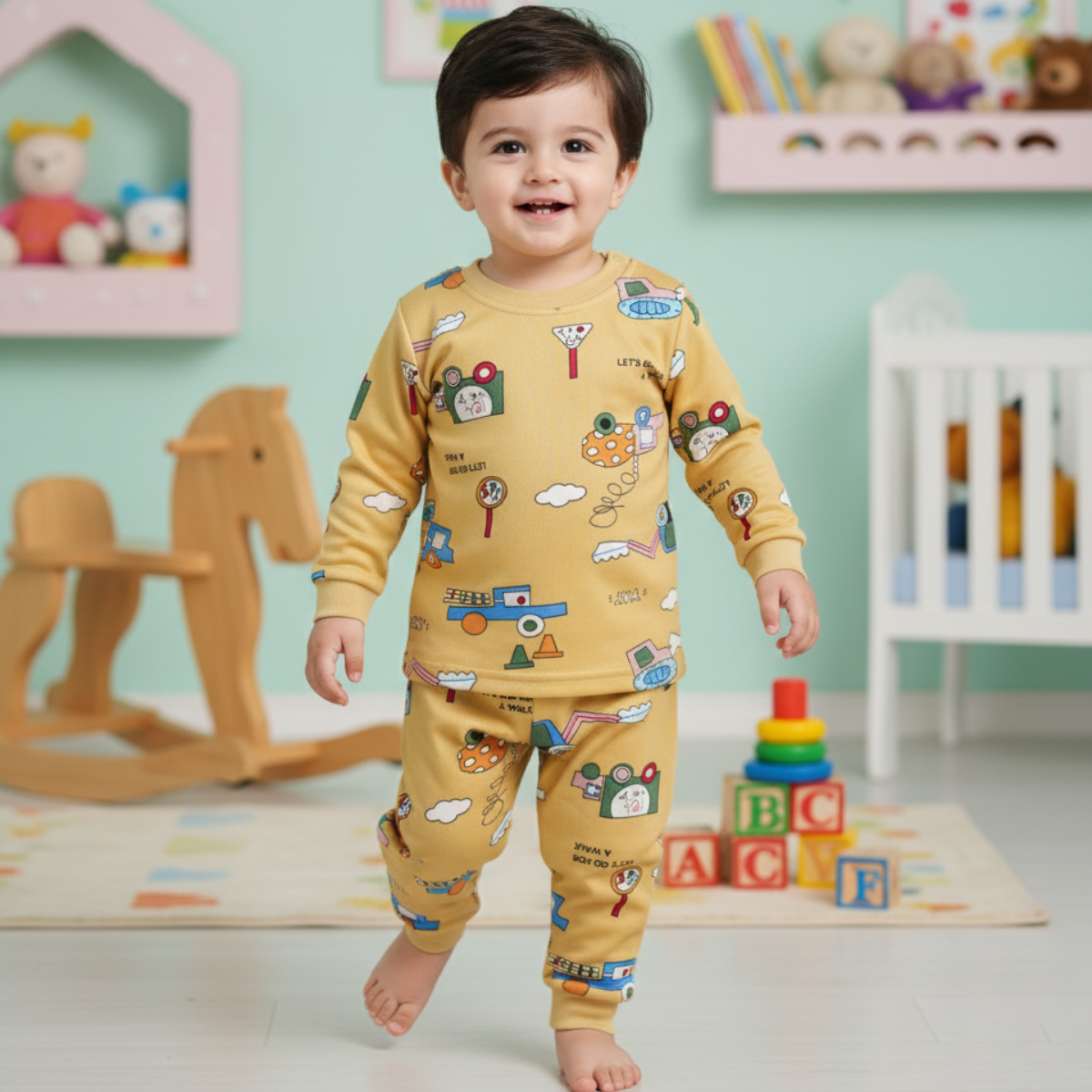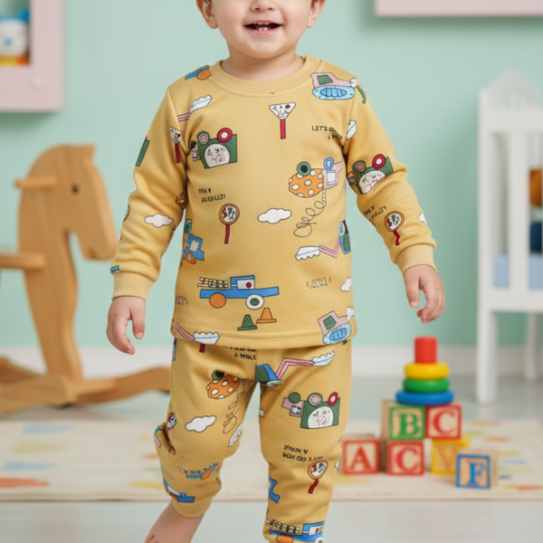 Your little one will be thrilled with this imported fleece full-sleeves shirt and pajama set in Yellow, featuring an exciting "YAY Truck" print. Crafted from stretchable, warm, and incredibly soft fabric, it provides cozy comfort for both playful days and restful nights. Perfect for young truck enthusiasts ready for adventure!