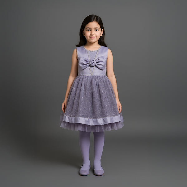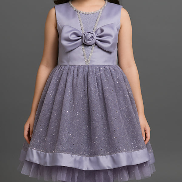 This stunning lavender frock is crafted from premium satin and layered with a soft net overlay sprinkled with glitter for a sparkling effect. The sleeveless satin bodice is adorned with a statement bow and rose accent, adding a touch of sophistication. A layered hemline enhances the flare, while the smooth inner lining ensures comfort. Perfect for parties, weddings, and festive occasions where elegance meets charm.