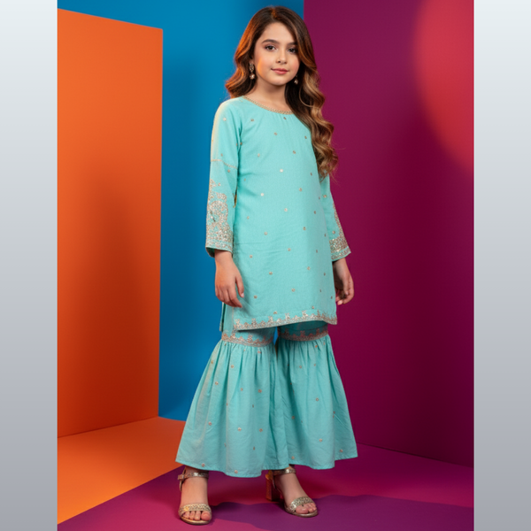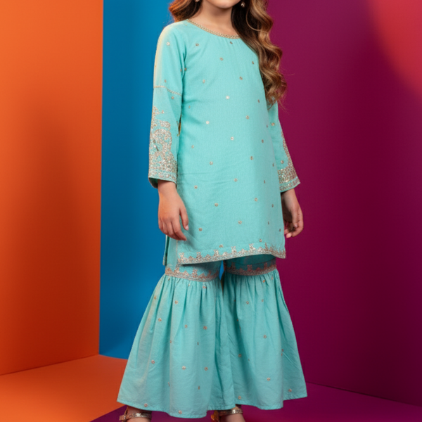 A stunning aqua blue outfit that radiates calm elegance with intricate golden embroidery. The kurta is beautifully paired with flared sharara pants, giving it a festive yet graceful appeal. Crafted from premium Marina fabric, it ensures comfort, breathability, and a stylish charm perfect for any celebration.