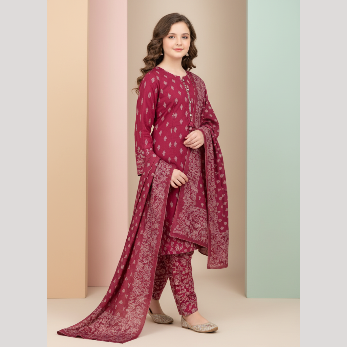 This beautiful fine lawn 3-piece suit features a stylish printed kameez in a rich ruby tone.
