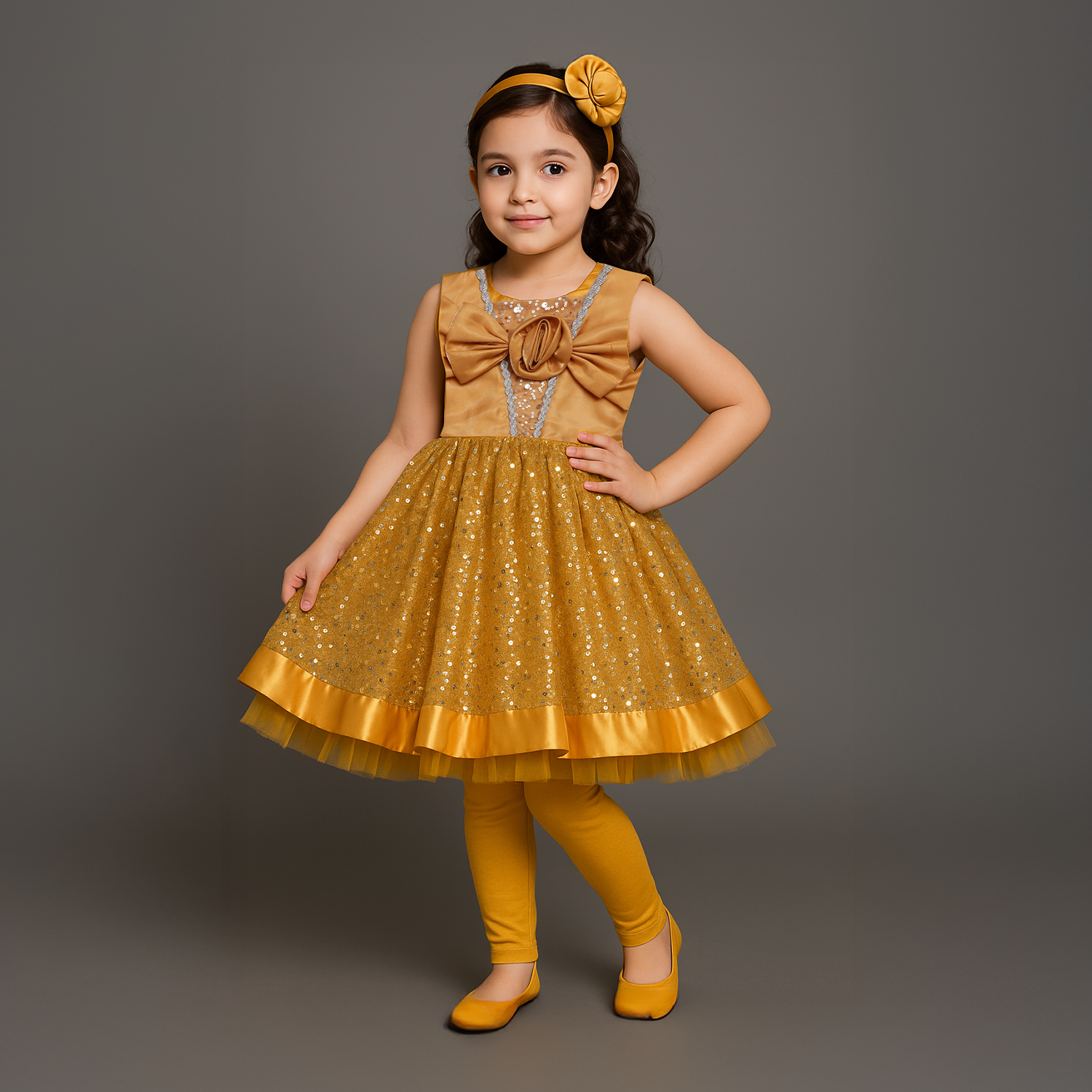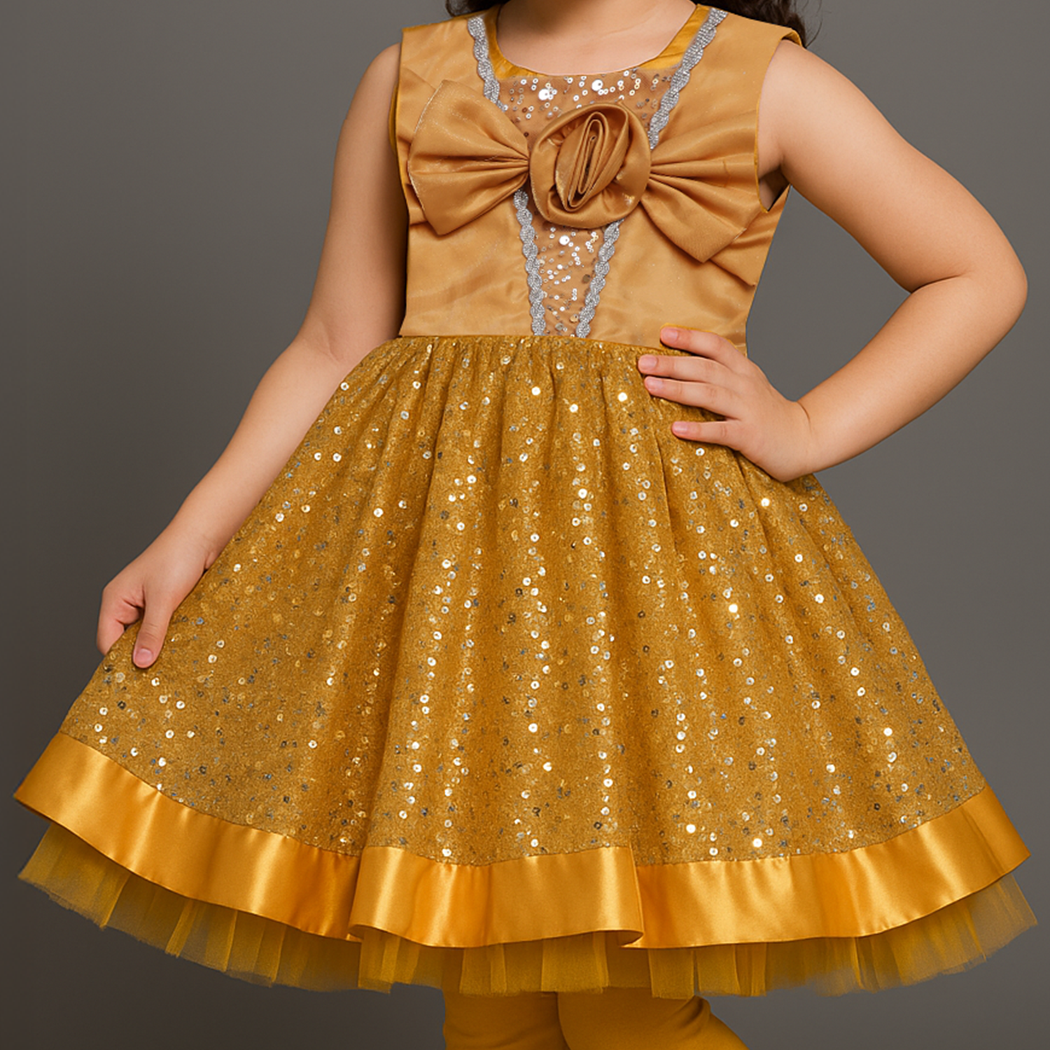 A charming mustard yellow frock featuring a sequin-embellished net flare, satin bow bodice, and layered hemline for a sparkling party-ready look.
