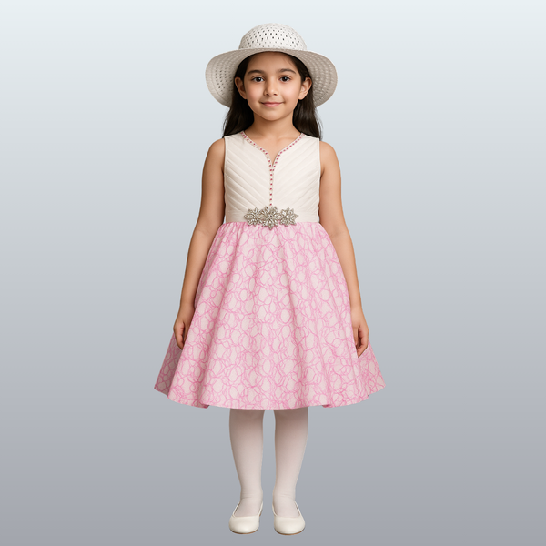 A dreamy frock crafted with a soft white bodice and a pink floral-patterned flare. The waistline is adorned with a sparkling floral brooch, adding a royal touch. Made from premium net and satin fabric, perfect for parties and festive occasions.