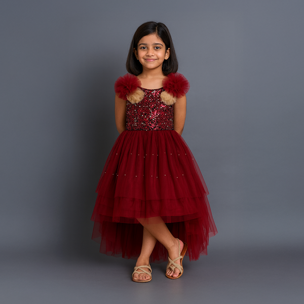This stunning frock features a sequined bodice in deep maroon, crafted from premium fabric for a sparkling and luxurious look. The layered net skirt with high-low hemline adds flow and volume, enhanced with delicate bead accents. Soft net shoulders with floral embellishments complete the dress, making it perfect for parties, weddings, and special celebrations.