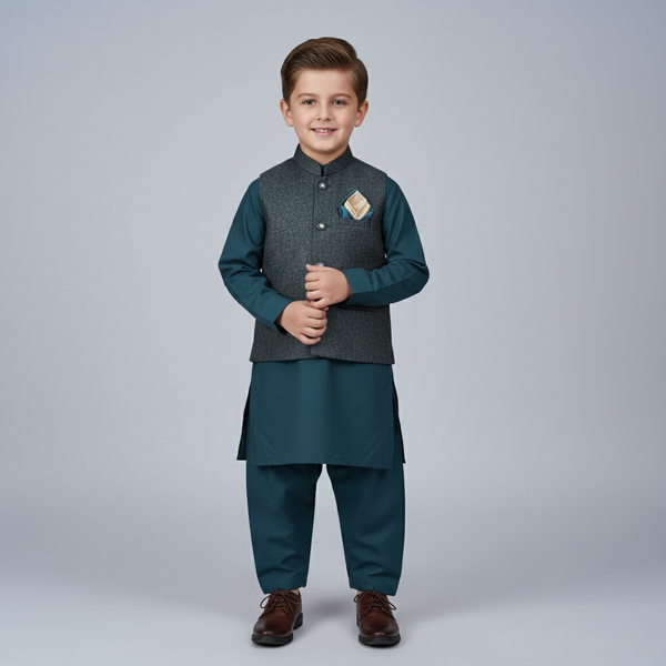 Crafted from premium washing-wear fabric, this shalwar kameez offers superior comfort, easy maintenance, and a crisp tailored look. The suiting-fabric waistcoat in charcoal adds a refined, modern touch with its structured texture and smart detailing. Perfect for weddings, festive gatherings, and formal events—keeping your little one effortlessly stylish and sharp.