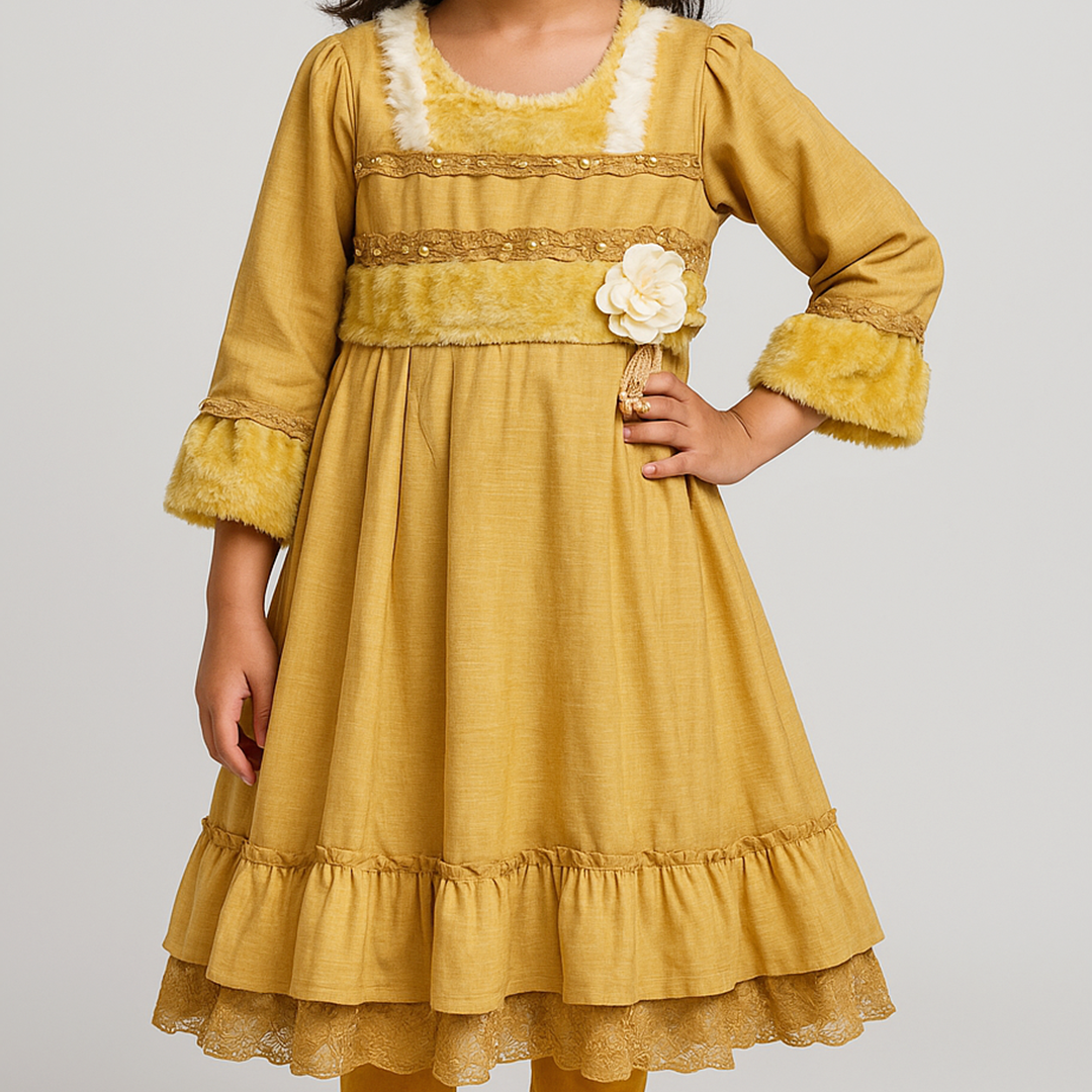 This elegant mustard dress is crafted from fine lawn fabric, offering breathability and comfort for all-day wear. The delicate lace and soft net at the hem, along with fur detailing on the sleeves and bodice, add a graceful touch. Paired with matching cotton leggings, it makes a perfect semi-formal outfit for your little princess.