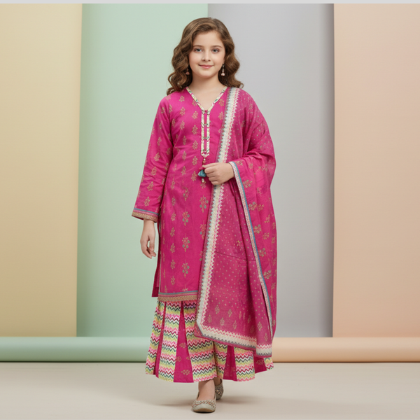 Crafted from premium lawn fabric for a soft and breathable summer feel. Paired with a delicate cotton net dupatta featuring elegant borders. The vibrant pink shade with subtle motifs adds festive charm. Perfect for Eid, parties, and family gatherings.